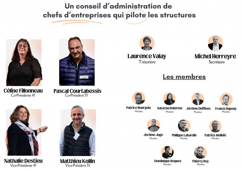 Elle est dirigée aujourd’hui par un Conseil d’Administration composé de 16 chefs d’entreprises répartis sur le Lot-et- Garonne et le Sud Gironde.